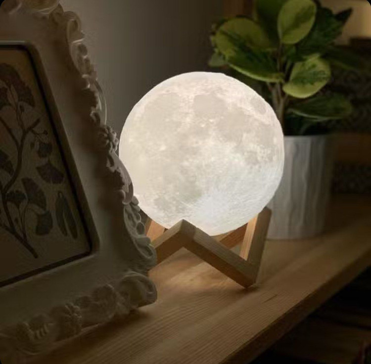 طراحی سهبعدی واقعی از کره ماه شارژی با کابل USB پایه چوبی زیبا و مقاوم تغییر رنگ با لمس یا ضربه قابلیت تنظیم شدت نور مصرف انرژی کم و سازگار با محیط زیست