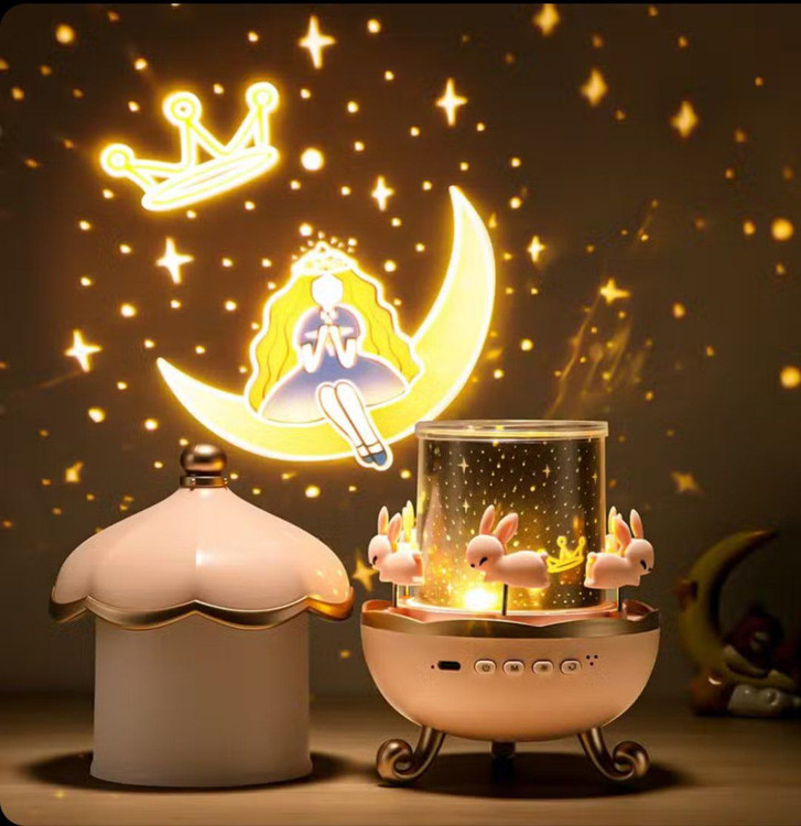 چراغ خواب پروژکتوری چرخوفلک خرگوشی، با قابلیت پخش موسیقی از طریق بلوتوث، نورپردازی آرامشبخش، طرحهای زیبا روی دیوار و باتری شارژی، انتخابی فوقالعاده برای اتاق خواب کودک و دکور فانتزی است🥰