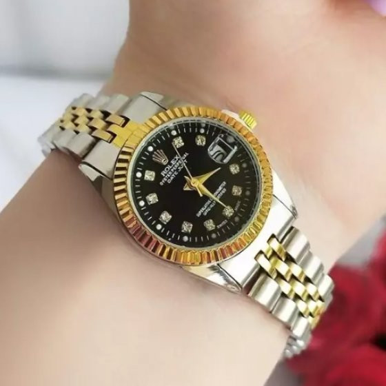 ساعت رولکس زنانه مردانه دیت جاست بند نقره ای طلایی صفحه مشکی رنگبندی کد1532
