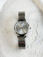 ساعت مچی زنانه ایمپرو آرمانیEMPORIO ARMANI بنداستیل نقره ای صفحه گرد عقربه ای رنگ صفحه سفید