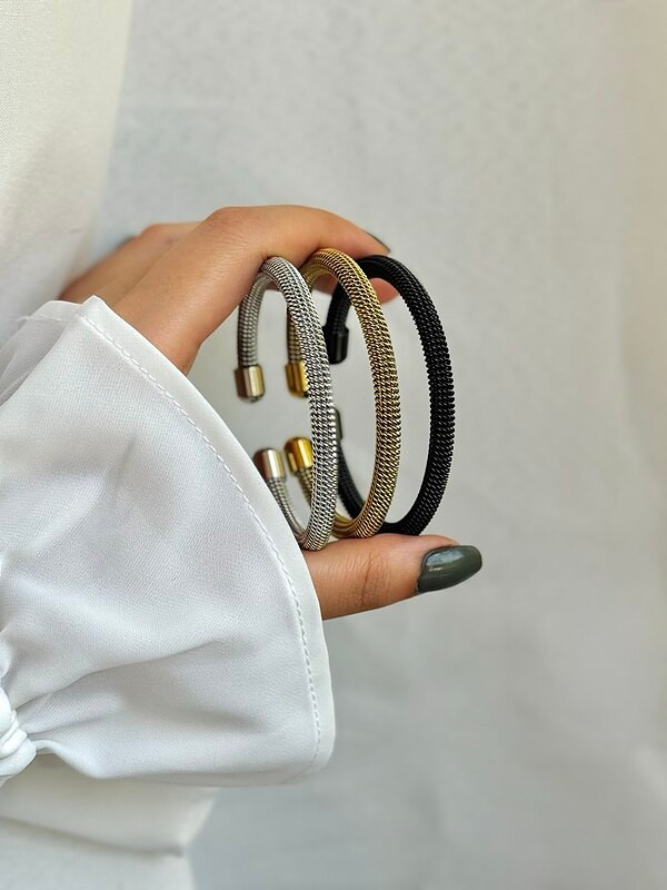بنگل دستبند استیل زنانه و مردانه مدل حصیری فری سایز در رنگبندی طلایی نقره ای مشکی