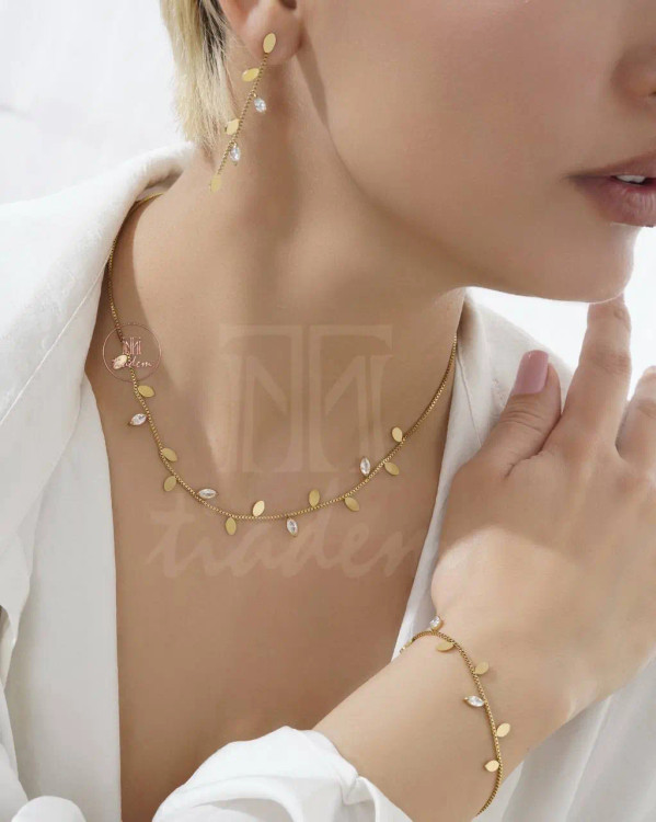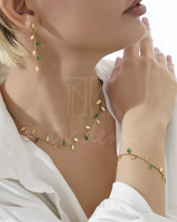 سرویس طرح برگ معمولاً شامل گردنبند، دستبند، گوشواره با طراحی الهامگرفته از برگهای طبیعی است. این سبک به دلیل ظرافت و زیبایی، گزینهای محبوب در میان علاقهمندان به جواهرات مینیمال است.