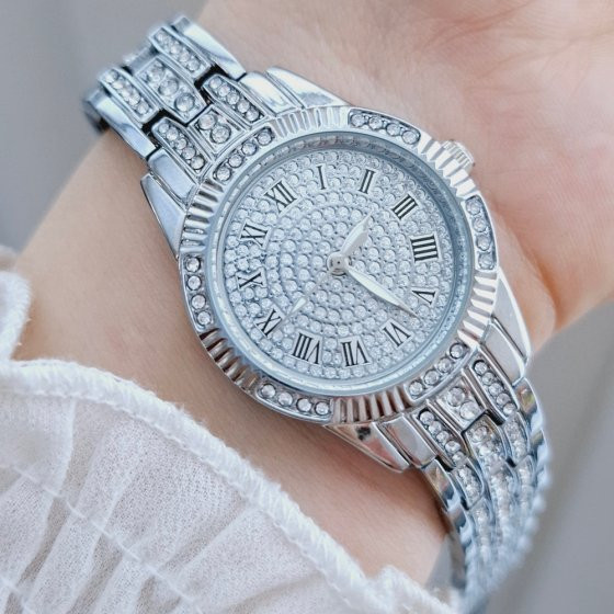 ساعت مچی زنانه فول نگین ROLEX رولکس بند استیل نقره ایی صفحه نمایش گرد مجلسی شیک و جدید کد 9089