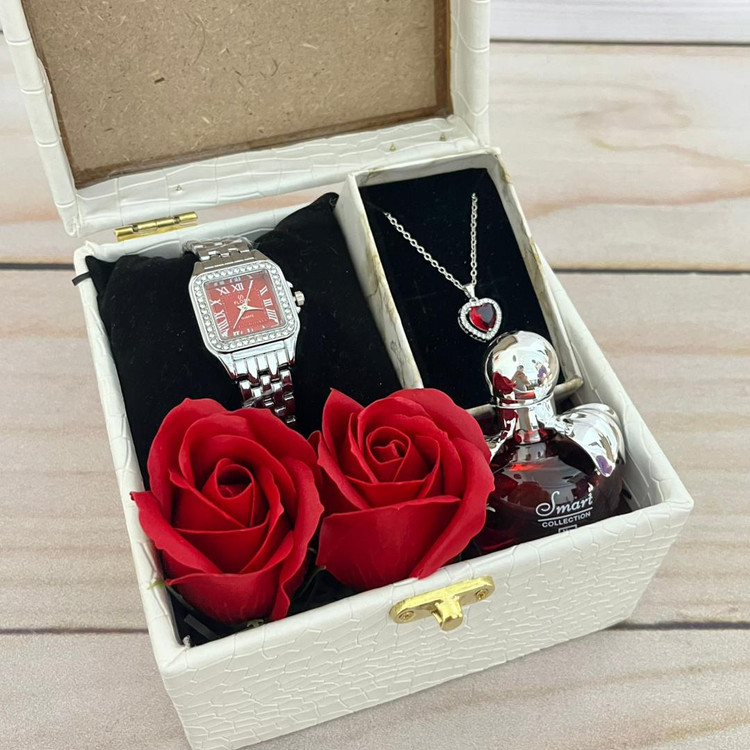 محتویات .ساعت بند استیل .ادکلن ۲۵ میل .گردنبند .گل تزئینی .جعبه هدیه صندوقی و تقویم