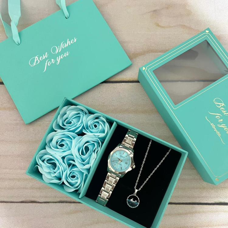 مشخصات: .ساعت بند استیل تاریخ دار طرح کاسیو .گردنبند .جعبه گل دار و ساک دستی