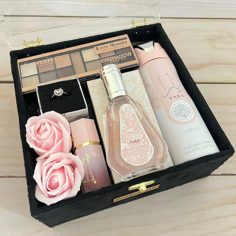 محتویات .ادکلن ۵۰ میل .اسپری بدن .رژگونه .انگشتر فیری سایز (سایز قابل تغییر به صورت دستی) .سایه .گل تزئینی .باکس در طلقی