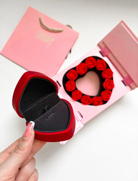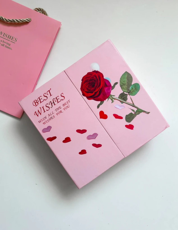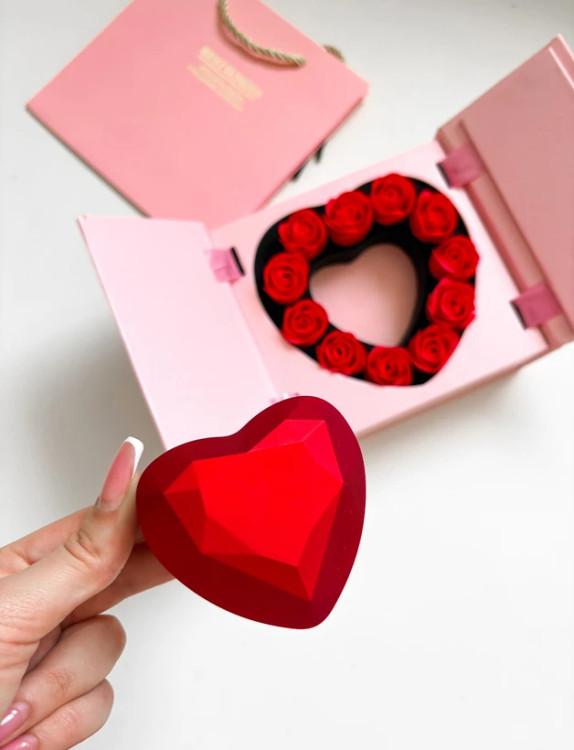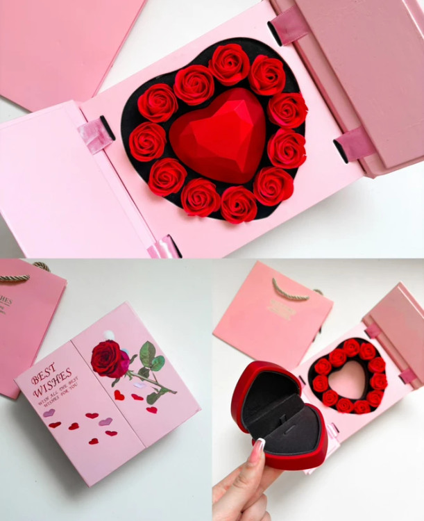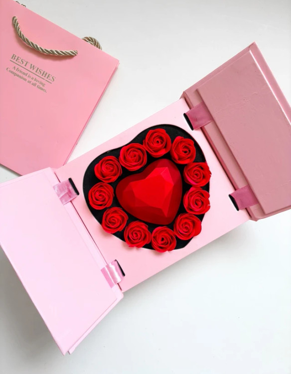 جعبه به شکل کتابی باز میشه و دوباره یک باکس دیگه داخلش هست گل ها معطر و صابونی ، داخل باکس قلبی میتونید انگشتر و یا نیم ست ظریف بزارید