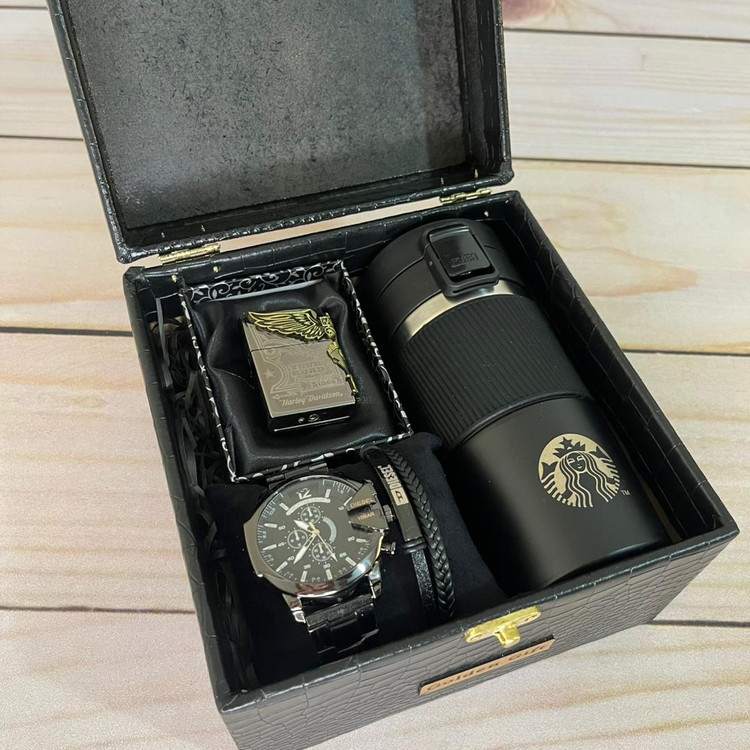مشخصات : .ساعت طرح دیزل .دستبند دو لاین چرمی .فندک طرح زیپو گازی .تراول ماگ دوجداره .جعبه هدیه صندوقی