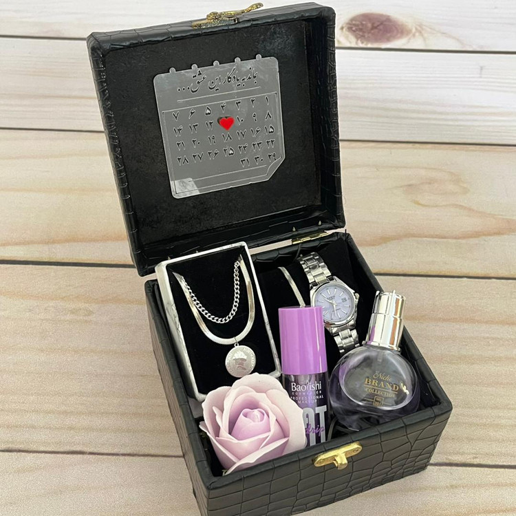 مشخصات: .ساعت طرح کاسیو .دستبند .گردنبند دو لاین الیزابت .ادکلن ۲۵ میل برند رایحه اکلت .برق لب هولوگرامی .گل تزئینی .جعبه هدیه صندوقی