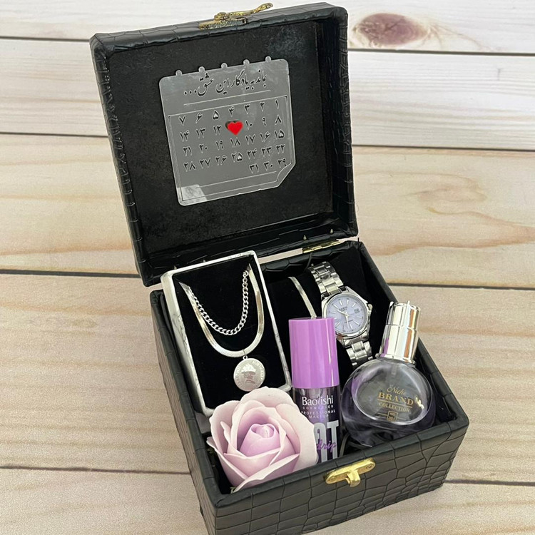 مشخصات : .ساعت طرح کاسیو .دستبند .گردنبند دو لاین الیزابت .ادکلن ۲۵ میل برند رایحه اکلت .برق لب هولوگرامی .گل تزئینی .جعبه هدیه صندوقی