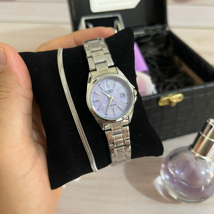 .ساعت طرح کاسیو .دستبند .گردنبند دو لاین الیزابت .ادکلن ۲۵ میل برند رایحه اکلت .برق لب هولوگرامی .گل تزئینی .جعبه هدیه صندوقی