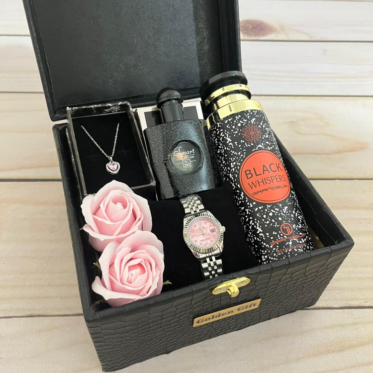 مشخصات: .اسپری بدن .ادکلن ۲۵ میل .ساعت طرح رولکس دارای روزشمار .گردنبند طرح جواهری .گل تزئینی .جعبه هدیه صندوقی