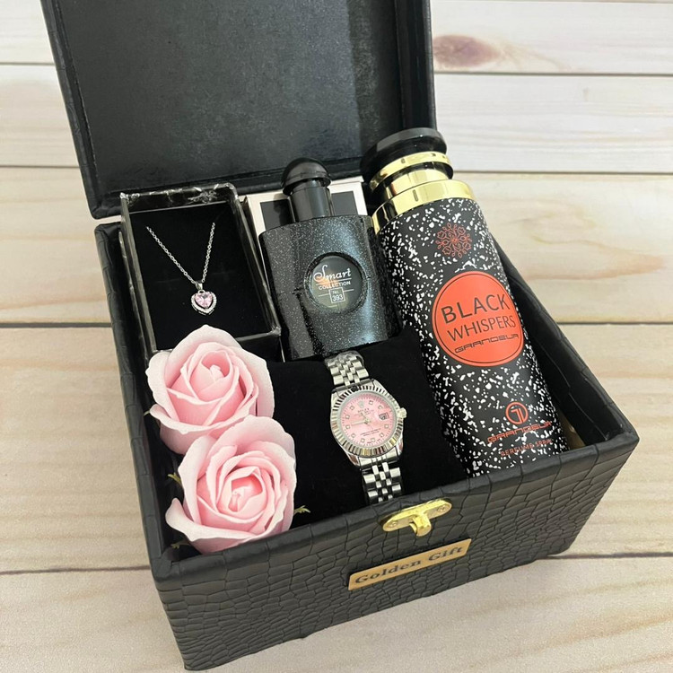 مشخصات : .اسپری بدن .ادکلن ۲۵ میل .ساعت طرح رولکس دارای روزشمار .گردنبند طرح جواهری .گل تزئینی .جعبه هدیه صندوقی