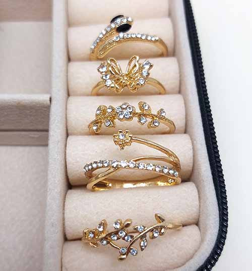 عداد پک انگشتر : 5 عدد انگشتر رنگبندی : طلایی جنس : مراقبتی ( کیفیت عالی ) کیفیت عالی در رنگبندی و جنس مقاوم در برابر خورگی نگین رنگی کریستالی کیفیت عالی با چسبندگی عالی