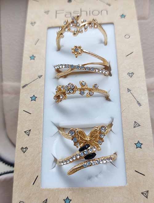 عداد پک انگشتر : 5 عدد انگشتر رنگبندی : طلایی جنس : مراقبتی ( کیفیت عالی ) کیفیت عالی در رنگبندی و جنس مقاوم در برابر خورگی نگین رنگی کریستالی کیفیت عالی با چسبندگی عالی