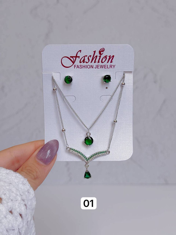 مشخصات: نیمست مجلسی/گردنبند+گوشواره/جنس ابکاری نقره/ضدحساسیت/گردنبنددارای زنجیر باقابلیت تنظیم ارتفاع/نگین مخراج کاری شده/هرگونه بدلیجات از موادشوینده عطر ادکلن استخر عرق اسیدی دور باشند