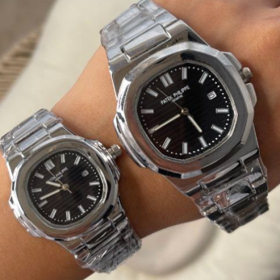 ست ساعت مچی مردانه و زنانه پتک فیلیپ ناتیلوس سیلور Patek philippe ، بند استیل توپر، های‌کپی لوکس+باطری اضافی کد 9898