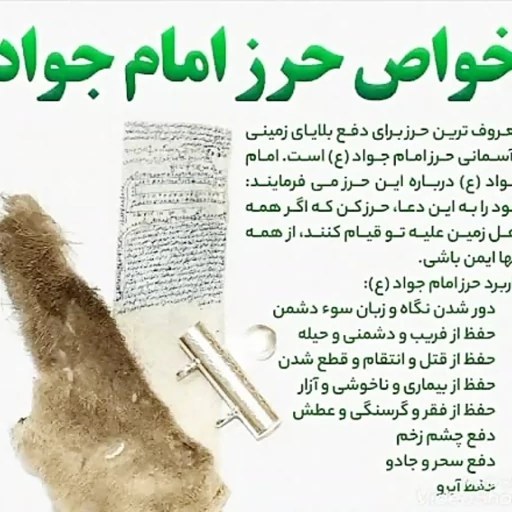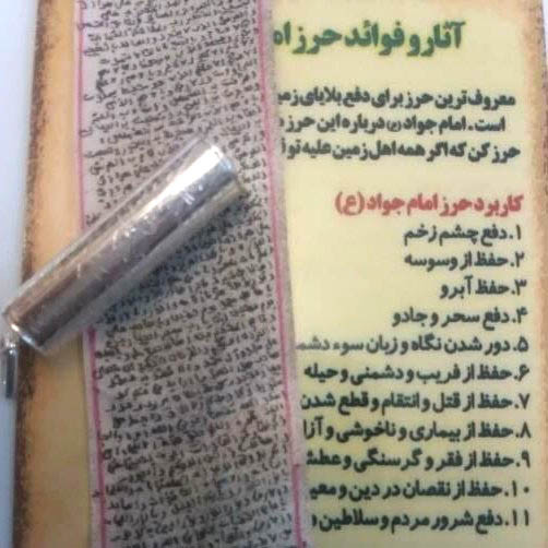 سیلندر نقره حرز امام جواد علیه السلام عنوان محصول جادعایی نقره باز شو حرز امام جواد [حرز صغیر امام جواد] فریم / رکاب نقره 925 حرز صغیر امام جواد وزن تقریبا 1.5 گرم