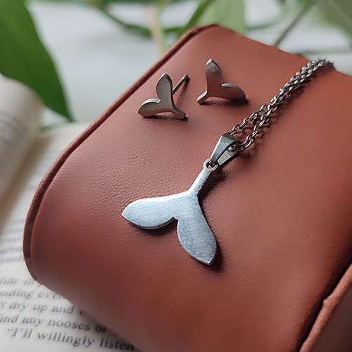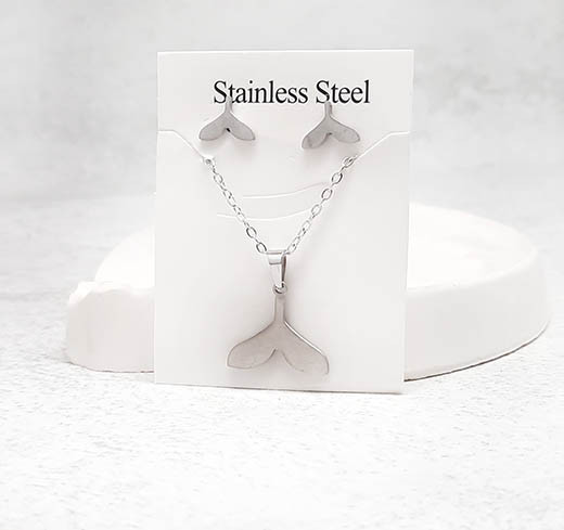 مشخصات: طرح دم وال پلاک استیل زنجیر 45 سانت زنجیر استیل رنگ ثابت قفل و اتصلات استیل گوشواره طرح دم وال مدل گشواره میخی استیل بدون حساسیت