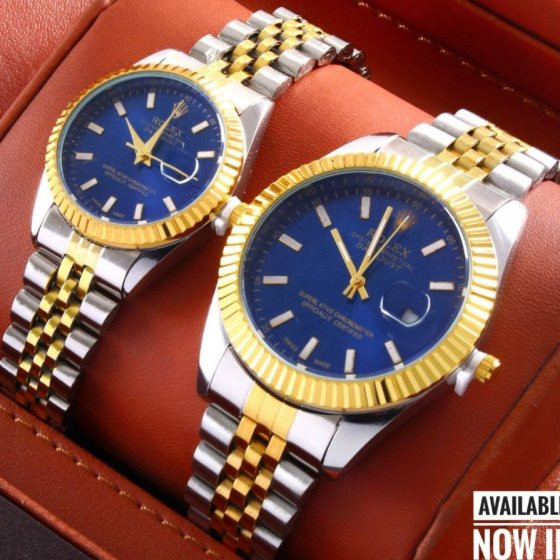 ست ساعت مچی زنانه و مردانه رولکس دیت جاست بند دو رنگ نقره ای طلایی صفحه گرد ضد آب سورمه ایی شیک+باطری اضافی کد 9144