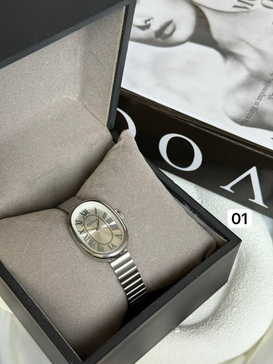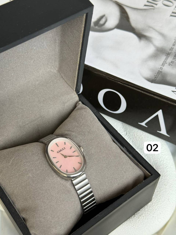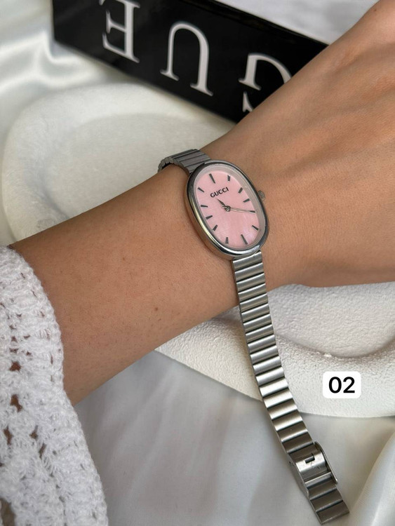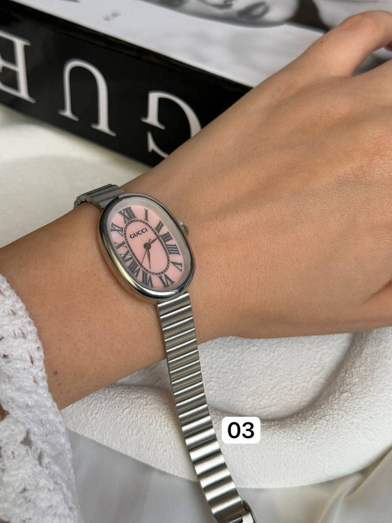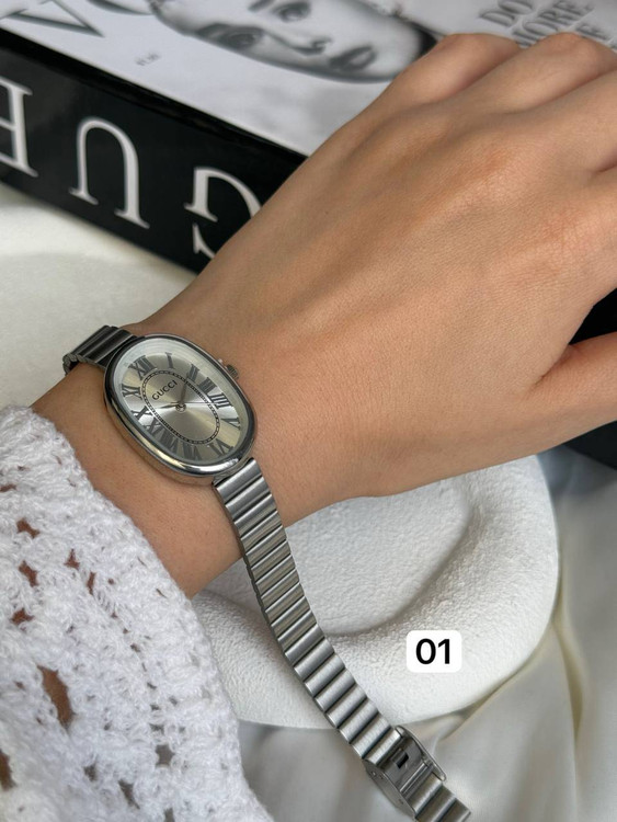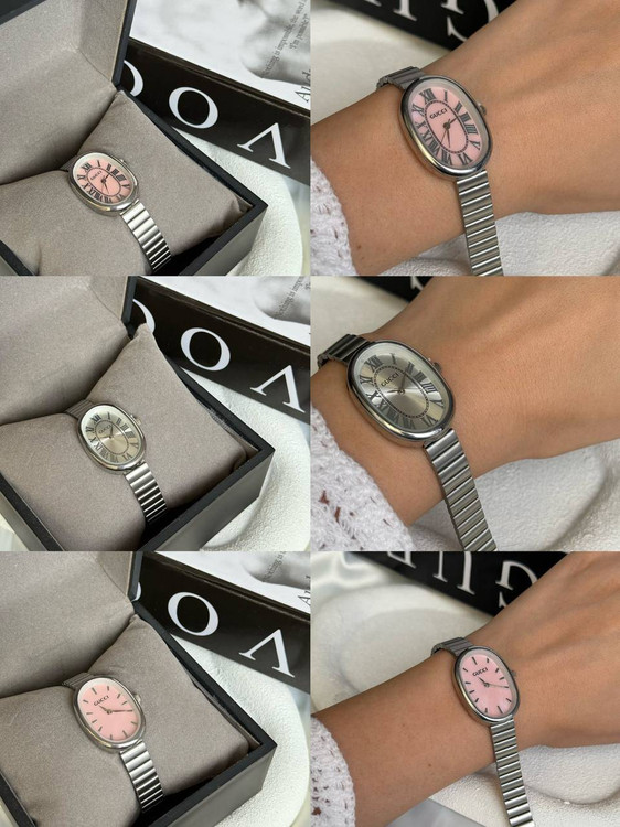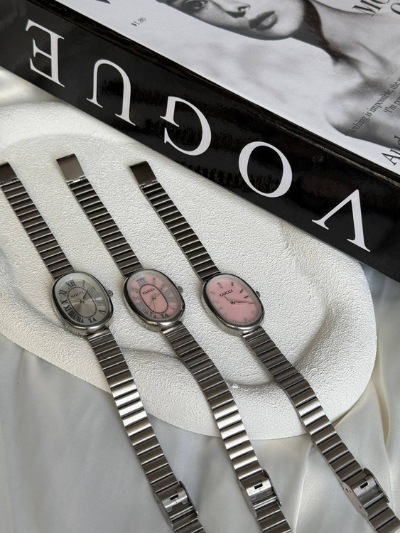 ساعت دخترانه/برندگوچی/صفحه بیضی/بندوبک استیل/ضدحساسیت/بندکرکره ای/باتری دارد/باتری وموتور قابل تعویض