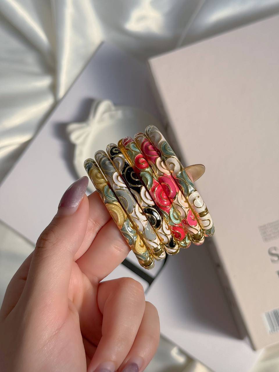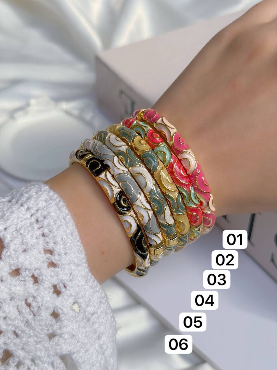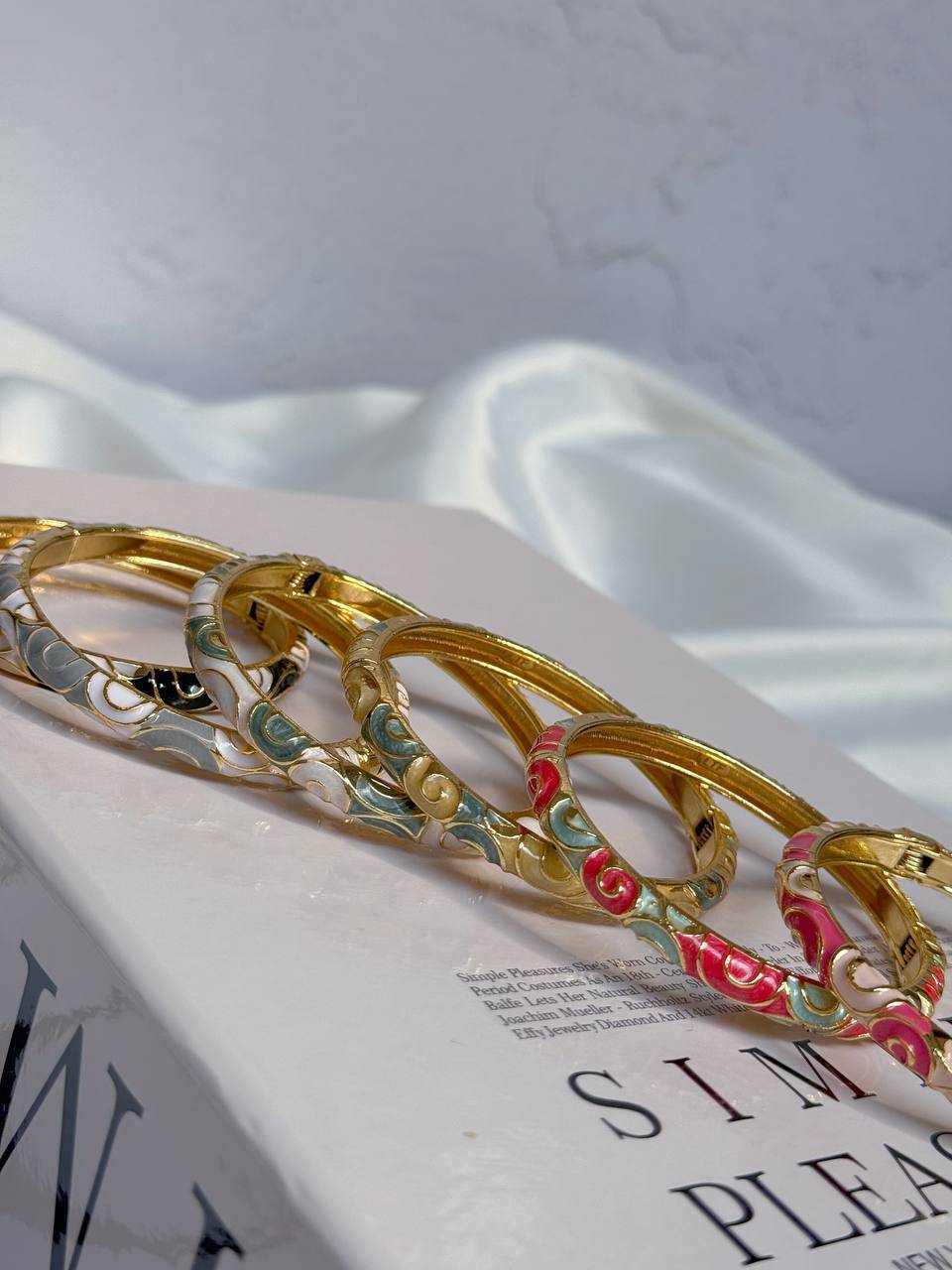 کالکشن بنگل میناکاری1239بنگل میناکاری/ابکاری طلا/کیفیت بالا/واردتی/بازوبسته میشود/مناسب هرسایزمچ میشود/ضدحساسیت/هرگونه بدلیجات از موادشوینده عطر ادکلن استخر عرق اسیدی دور باشند