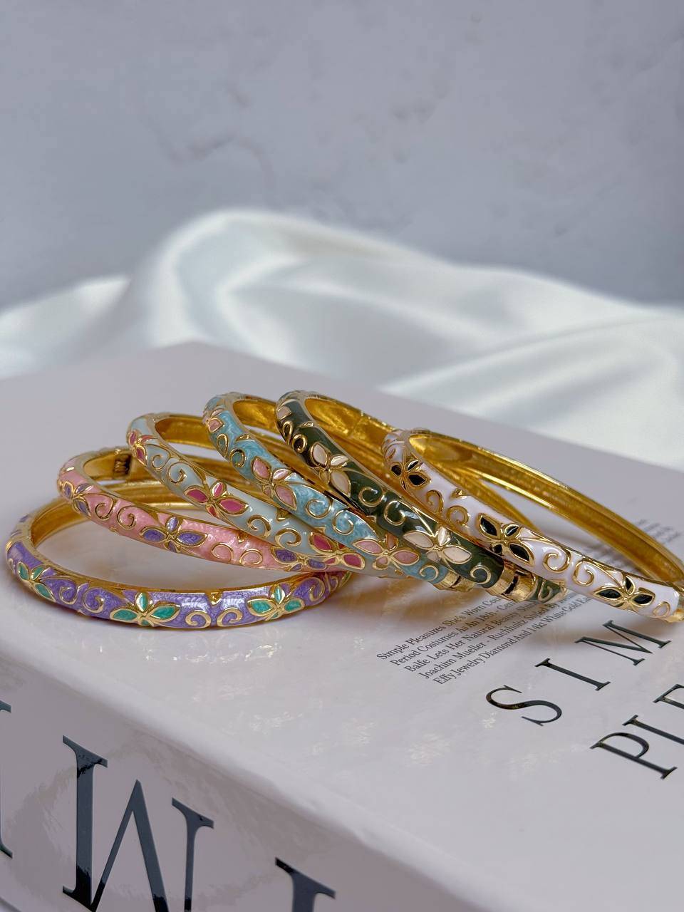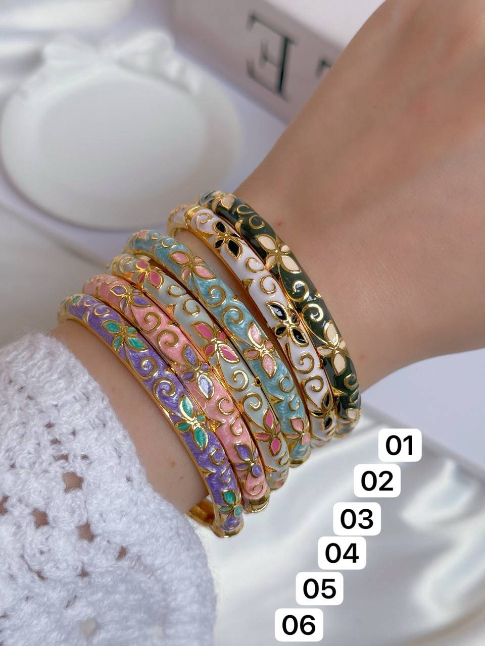 کالکشن بنگل میناکاری1242بنگل میناکاری/ابکاری طلا/کیفیت بالا/واردتی/بازوبسته میشود/مناسب هرسایزمچ میشود/ضدحساسیت/هرگونه بدلیجات از موادشوینده عطر ادکلن استخر عرق اسیدی دور باشند
