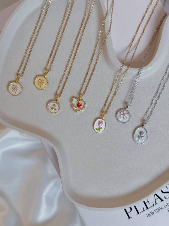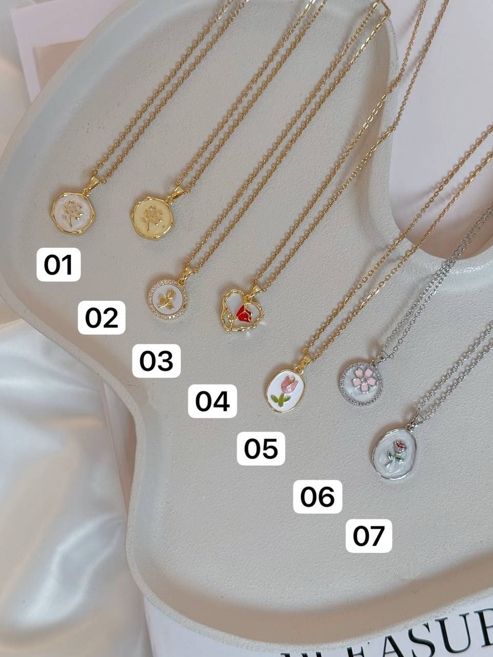 کالکشن گردنبندگل1259گردنبند/زنجیر استیل/پلاک ابکاری/ضدحساسیت/کیفیت بالا/نگین مخراج کاری شده/هرگونه بدلیجات از موادشوینده عطر ادکلن استخر عرق اسیدی دور باشند