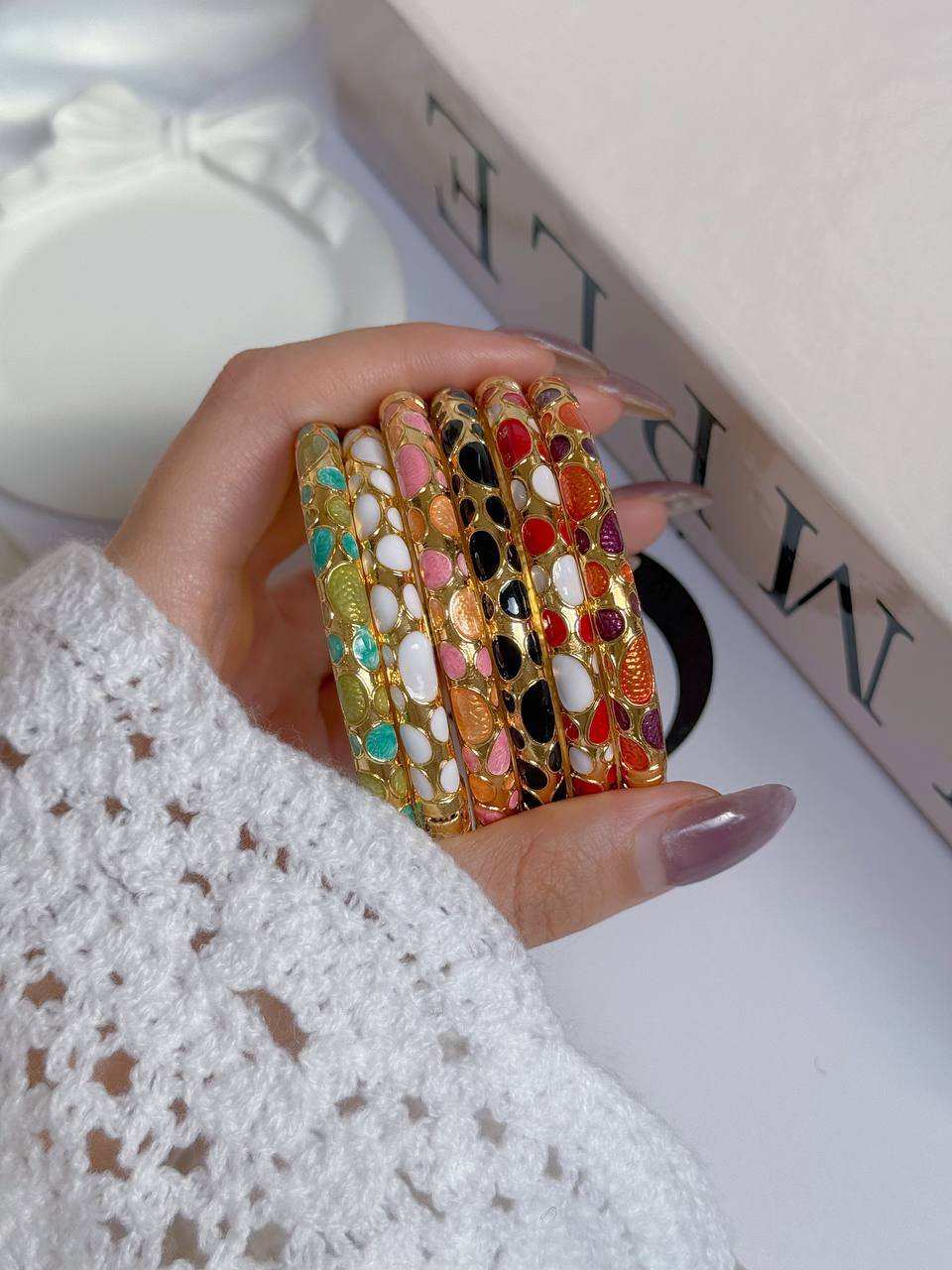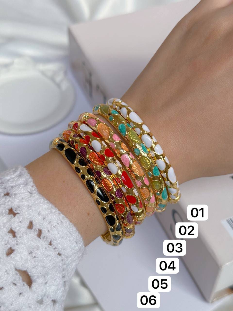 کالکشن بنگل میناکاری1240 بنگل میناکاری/ابکاری طلا/کیفیت بالا/واردتی/بازوبسته میشود/مناسب هرسایزمچ میشود/ضدحساسیت/هرگونه بدلیجات از موادشوینده عطر ادکلن استخر عرق اسیدی دور باشند