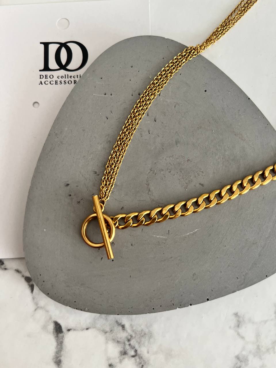 گردنبند زنانه فوق العاده ترکیبی کارتیر -درشت و ۴لاین زنجیر ظریف همراه با قفل T استیل و رنگ ثابت همراه با زنجیر تغییر سایز