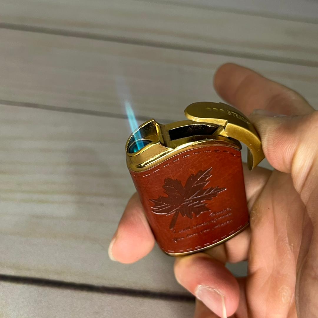 فندک اتمی روکش چرمی طرح برگ .شعله اتمی .سوخت گازی .روکش چرمی