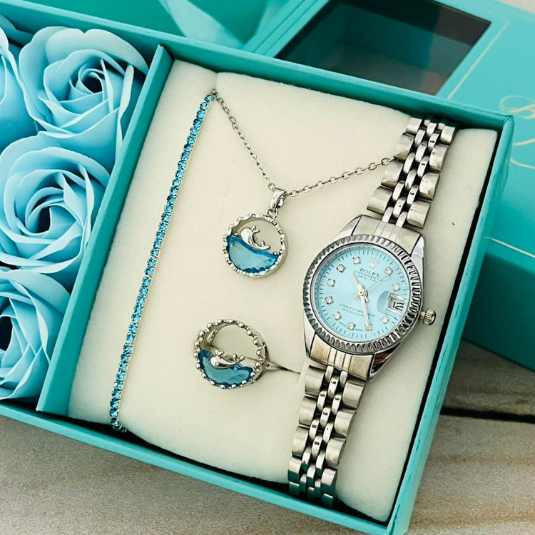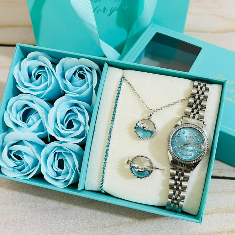 محتویات .ساعت رولکس .دستبند کشی .ست گردنبند و انگشتر وال (انگشتر فیری سایز می باشد) .جعبه کادویی گل دار