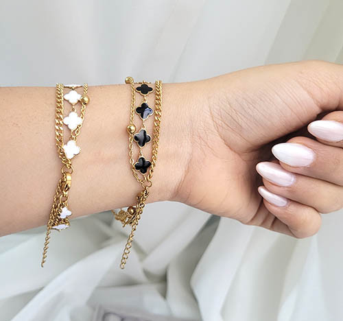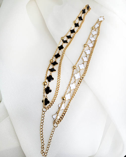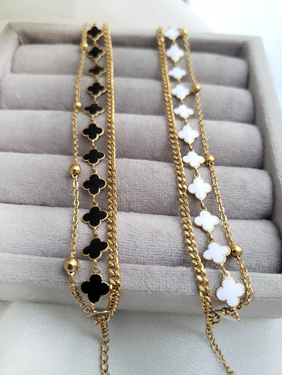مشخصات: دستبند سه لاین استیل رنگ ثابت لاین اول زنجیر خلخال طلایی طول 16 سانت لاین دوم زنجیر ونکلیف پایه طلایی رنگ گل سفید و مشکی طول 16 سانت لاین سوم کارتیر تراش طلایی طول زنجیر 16 سانت طول زنجیر سایز رنگ طلایی طلایی 5 سانت قفل و اتصالات استیل رنگ ثابت
