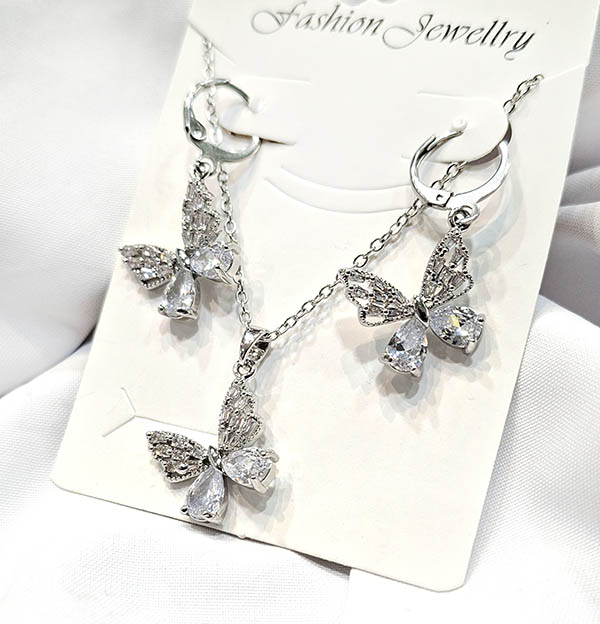مشخصات: گردنبند : طرح پروانه پلاک سوارسکی زنجیر 45 سانت زنجیر استیل رنگ ثابت قفل و اتصلات استیل گوشواره طرح پروانه مدل گشواره قفلی گرد استیل بدون حساسیت قلاب پیچ مراقبتی کیفیت عالی طرح پروانه پلاک سوارسکی