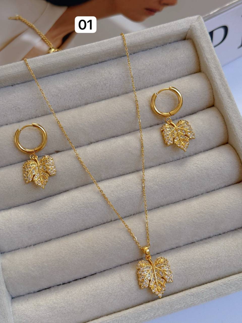 مشخصات: نیمست برگی/طرح طلا/شامل گردنبند+گوشواره/ضدحساسیت/گردنبنددارای زنجیر با قابلیت تنظیم ارتفاع/گوشواره حلقه ای/جنس زنجیر استیل و جنس پلاک وگوشواره ابکاری/هرگونه بدلیجات از موادشوینده عطر ادکلن استخر عرق اسیدی دور باشند