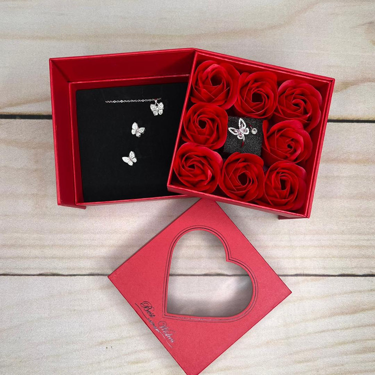 محتویات: ست گردنبند و گوشواره و انگشتر (جنس زنجیر استیل مابقی موارد مس ابکاری شده،انگشتر قابل تنظیم سایز) جعبه هدیه گل دار(مصنوعی)