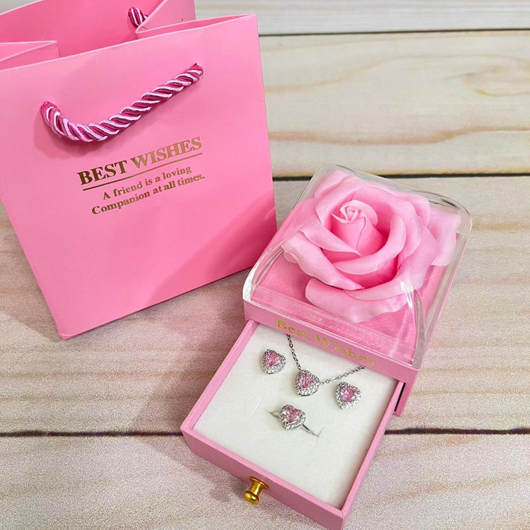 محتویات : .ست گردنبند و گوشواره و انگشتر (جنس زنجیر استیل مابقی موارد مس ابکاری شده،انگشتر قابل تنظیم سایز) جعبه هدیه گل دار(مصنوعی) و ساک دستی