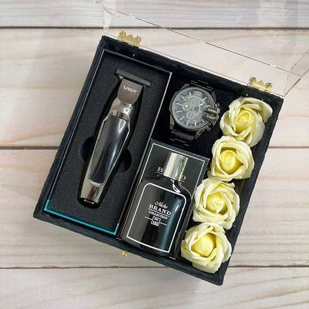 محتویات : موزر ریش تراش VGR دارای نمایشگر درصد شارژ ساعت طرح دیزل دارای روزشمار ادکلن ۲۵ میل برند با کیفیت و ماندگاری بالا گل تزئینی جعبه صندوقی پلکسی