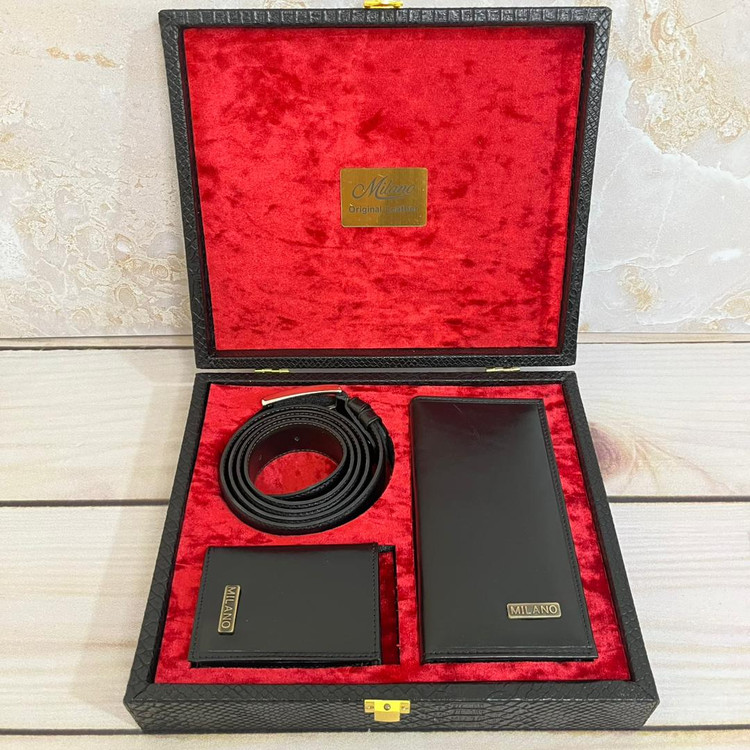 ست هدیه سه تکه تمام چرم طبیعی شامل: کیف پول کتی دارای چهارده جای کارت، جای پول مجزا و یک جیب زیپ دار برای سکه و اقلام ریز. جاکارتی دارای ده جای کارت اعتباری که بصورت کتابی باز و بسته میشود کمربند دو لایه با عرض ۳.۵ سانت جعبه چرمی صندوقی مناسب هدیه و یک کاور دسته دار .