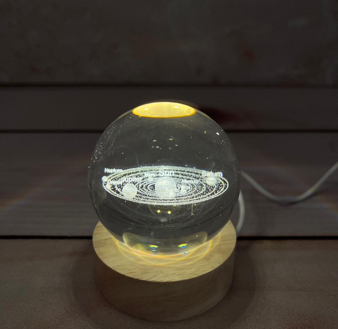 این چراغ خواب کریستالی به صورت سه بعدی و در طرح منظومه شمسی تولید شده که باعث جذابیت بیشتر اتاق خواب شما می شود. جنس این گوی شیشه ای از کریستال فشرده می باشد و همچنین دارای یک پایه چوبی و کابل برق USB می باشد که امکان اتصال به لپ تاپ، کامپیوتر، پاور بانک و شارژ گوشی را فراهم میسازد. این محصول دکوری منحصر به فرد و شیک و همچنین یک هدیه جذاب و ماندگار برای هر شخصی می تواند باشد.