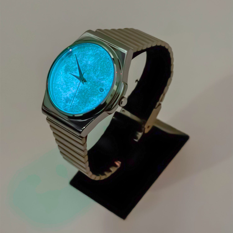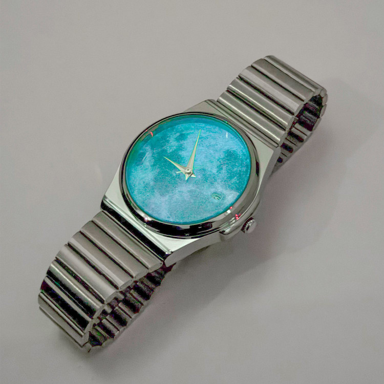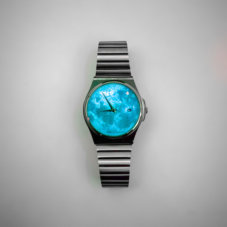 ساعت ماه شبتاب ابی مشخصات⚙️ صفحه ماه شبتاب ابی ( با جذب نور کافی در تاریکی مطلق شبتاب) بند استیل ضد حساسیت و رنگ ثابت قابل تظیم برای هر مچ دستی موتور ژاپنی تقویم دار