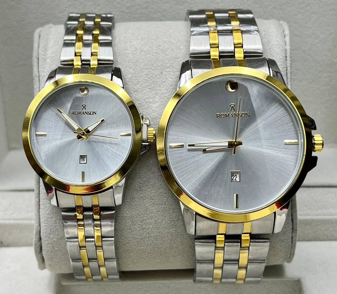 ست ساعت زنانه و مردانه رومانسون بنددورنگ طلایی صفحه سفید - کد 339